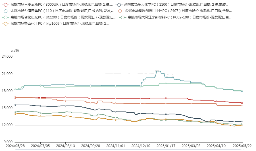 由于国内产能的急速扩张,PC由供不应求转变为全面过剩,国内PC产量也因此创历史新高。近年来,由于国产PC装置投产集中在低端货源,致使低价货源供应量剧增,导致市场整体价格走低。2023开始中国PC产能增速明显下降, 未来中国酚酮--双酚A--PC产业链,PC进入存量产能消化阶段,上游产业链产能增速下降,行业供需格局也将进一步发生实质性的变化。